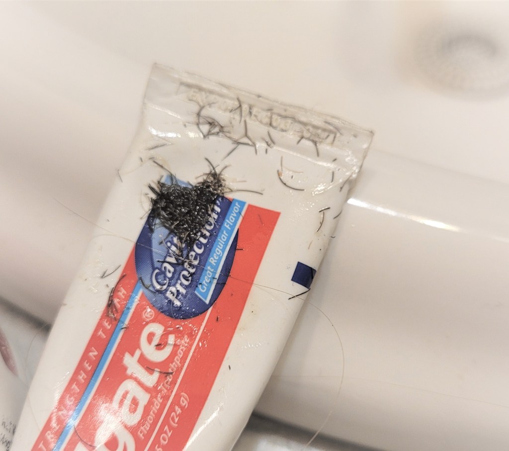 As I rummaged around, I saw a slightly used travel-size tube of toothpaste that looked as if it had some shampoo on it. As I plucked it out intending to throw it away, I noticed that a group of whiskers had collected at the crimped end of the tube and looking closer at it my heart skipped a beat. The whiskers were in the shape of a heart!
