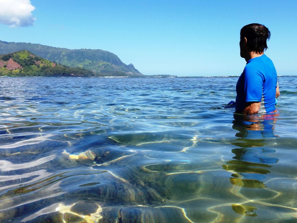 The entire setting was so breath-taking I spent the first 15 minutes just taking photos. Then I carefully walked to where Rick was alternating between exploring underwater and standing in the waist-high water to admire the mountains. This gave me a great opportunity to snap a photo of him admiring ‘Bali Hai’ without him knowing I was behind him. It was such a peaceful “is this real or are we dreaming this?” moment. The perfect tropical temperature, the blue sky with white clouds like sails on a slight breeze, the lush green hills and the crisp dancing prismatic ribbons of sunlight on the shallow water. We were both soaking in this idyllic moment in paradise.