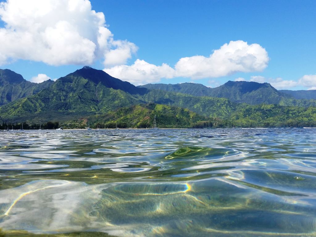 But what added to this incredible site was the backdrop. The lush green mountain ridge between Hanalei and the Na Pali coast was the backdrop, including the iconic ‘Bali Hai’ peak. And though the sky was mostly clear there were occasional bright white clouds drifting by.